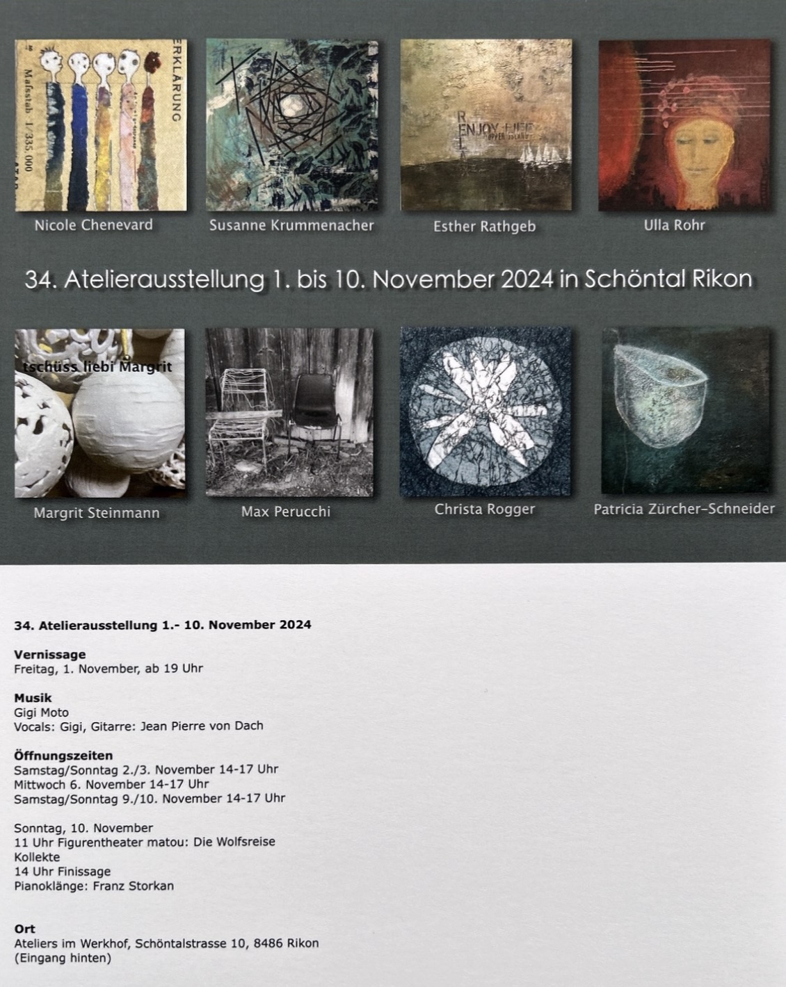 34. Atelierausstellung im Werkhof Schöntal, Rikon im Tösstal 01. - 10. November 2024 Vernissage: 01.11.2024 ab 19.00Uhr Austellung offen: 02. und 03.11.2024 14.00 bis 17.00 Uhr 06.11.2024 14.00 bis 17.00 Uhr 09. und 10.11.2024 14.00 bis 17.00 Uhr Flyer